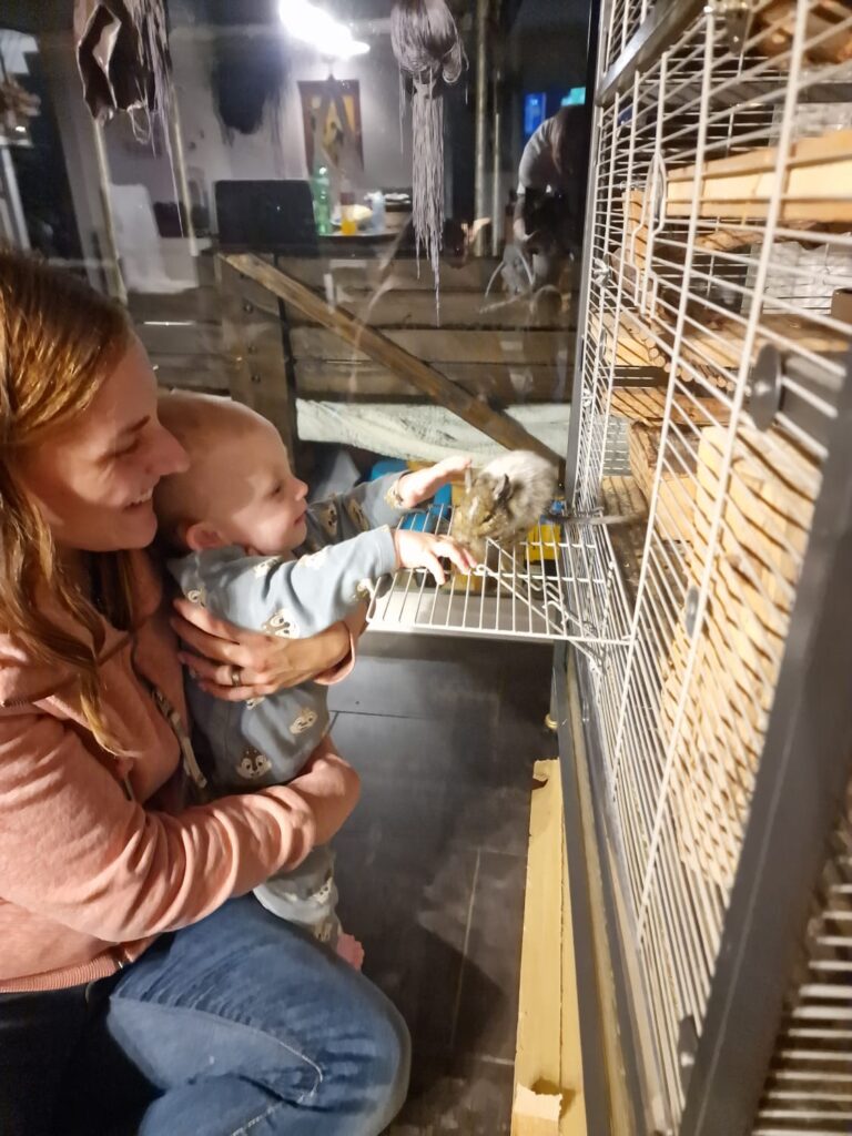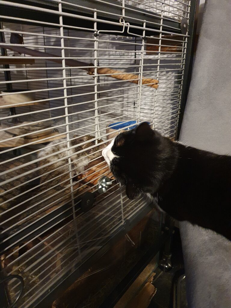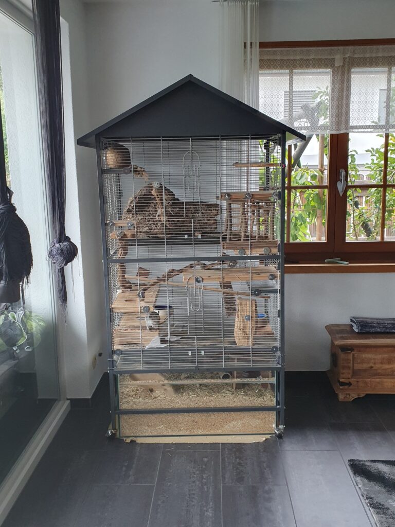 Wir vergrösserten kurze Zeit später unsere Familie mit einem weiteren Mitglied. Einer Katze. Zu unsere grosse Freude, waren die Katze und Alois von Anfang an ein Herz und eine Seele 🙂 Die Katze stand am Käfig schaute nach ihm und Alois kam schnurstracks zu ihr und sie beschnupperten sich immer wieder. Die zwei gehen mit so einer Sorgfalt miteinander um, dass ist jeweils so ein schöner und erstaunlicher Moment. Alois ist es sehr wichtig, nicht ausgeschlossen zu werden und möchte immer im Trubel dabei sein. Sobald eines der Kinder auch nur in der Nähe des Käfigs ist, kommt Alois zu ihnen und beobachtet sie.