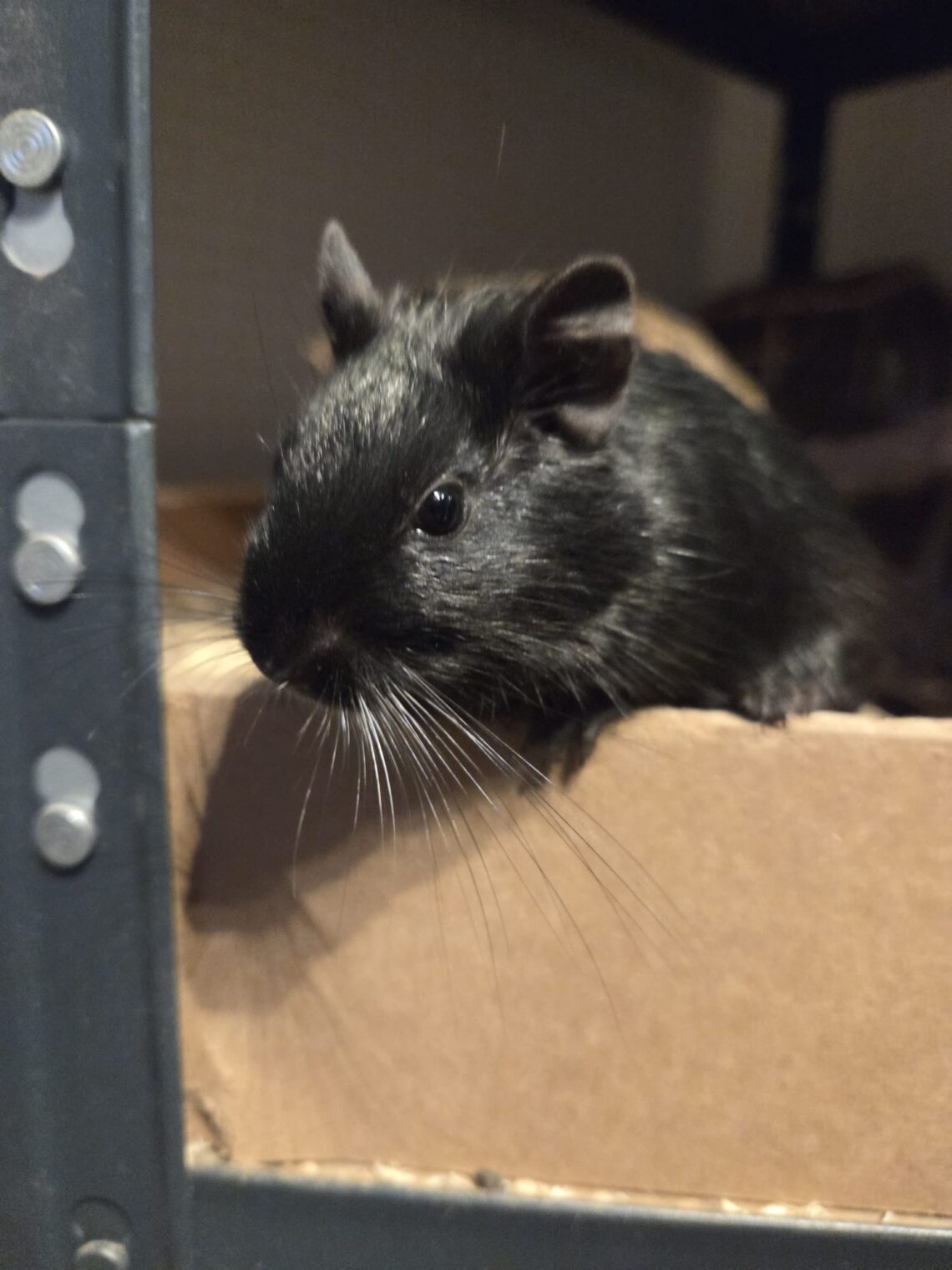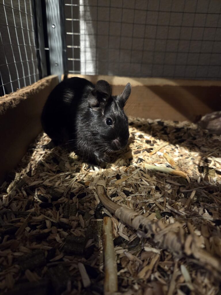 Leider kam es bei uns mehrfach zu sehr schlimmen Kämpfen unter meinen Degu Damen. Die Angreiferin ist immer die selbe welche eine Schwester nach dem anderen schwer verletzt. Darum suche ich schweren herzens ein Plätzen für sie mit einem katrierten Männchen. Sie kuschelt sehr gerne und holt ihr Leckerli gerne aus der Hand. Sie ist aber eher scheu und beobachtet viel. Sie ist erst halb jährig und wohnt in Appenzell. Ich wünsche mir für sie ein Platz an dem sie für immer bleiben kann und viel klettern und kuscheln kann.